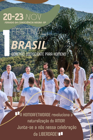 O 1º Festival Homoafetivo Brasil, (a 100 km de São Paulo-SP) é um encontro inédito, criado por e para homens homoafetivos DE TODAS AS IDADES, RAÇAS, CLASSES E crenças que desejam expandir a experiência de conexão consciente consigo mesmo, com o outro, com a Arte e a natureza.